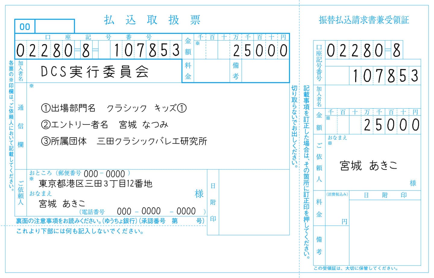 | 通信欄 | ①出場部門名(クラシック・モダンの部門名とキッズ①などクラス名まで記入のこと) ②エントリー者名(アンサンブル部門は代表者名と他参加者数) ③所属団体名 以上を必ずご記入下さい。 |