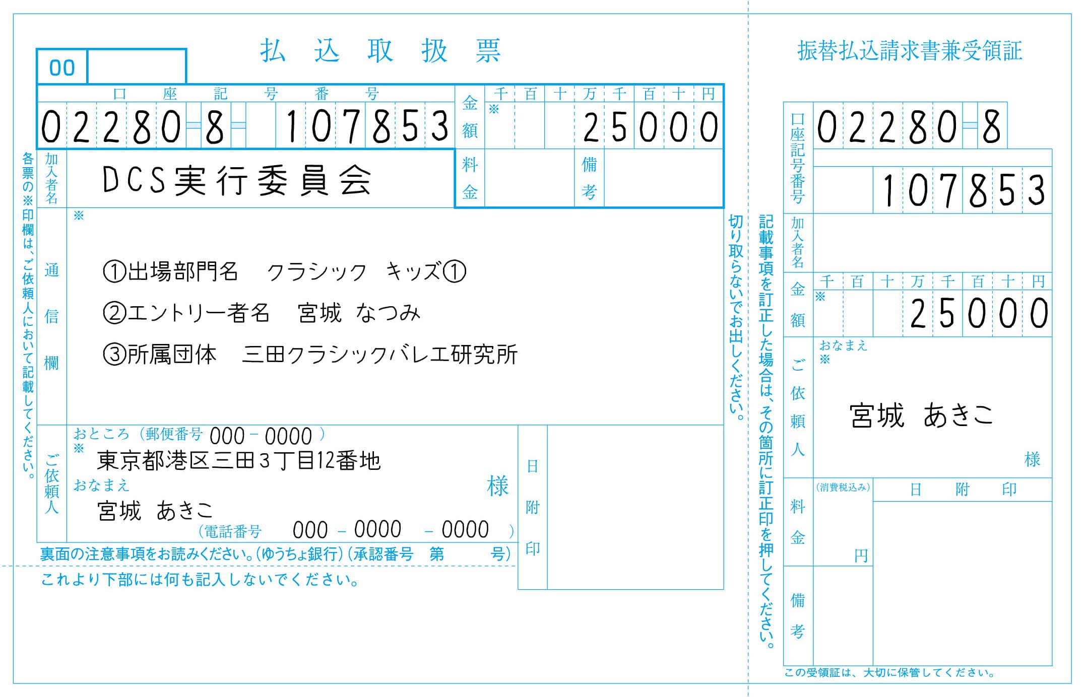 | 振込先 | ゆうちょ銀行 口座番号 02280-8-107853 加入者名 DCS実行委員会(ディー・シー・エス ジッコウイインカイ) |