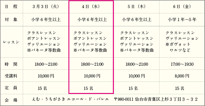 | 申込方法 | 申込書に必要事項をご記入の上、現金書留にて下記までお送りください。 〒980-0011 仙台市青葉区上杉3丁目3−32 えむ・うちがさきエコール・ド・バレエ内 特別講習会事務局宛 |